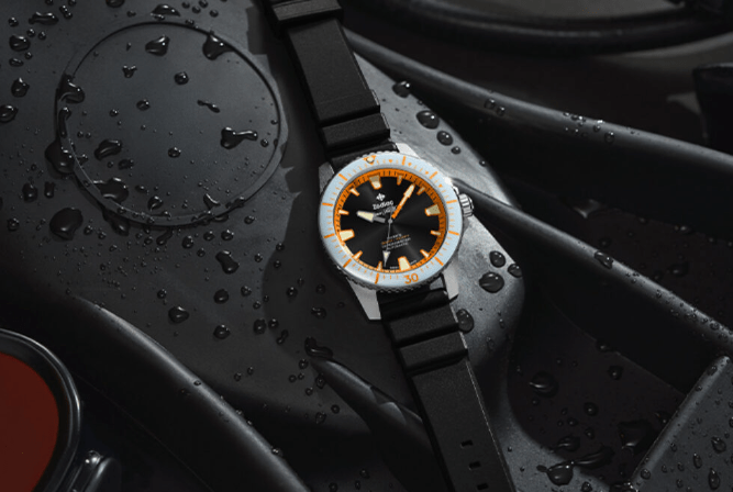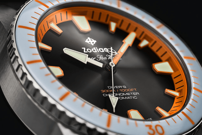 The colorway, though, is where Zodiac and GiantMouse set this edition apart. The black sunray dial carries orange hour markers and a pale blue ceramic bezel insert, a direct callback to a 1970s “Exotic” colorway that Wirth himself owns. Gold-toned hands add some contrast to the stark palette.